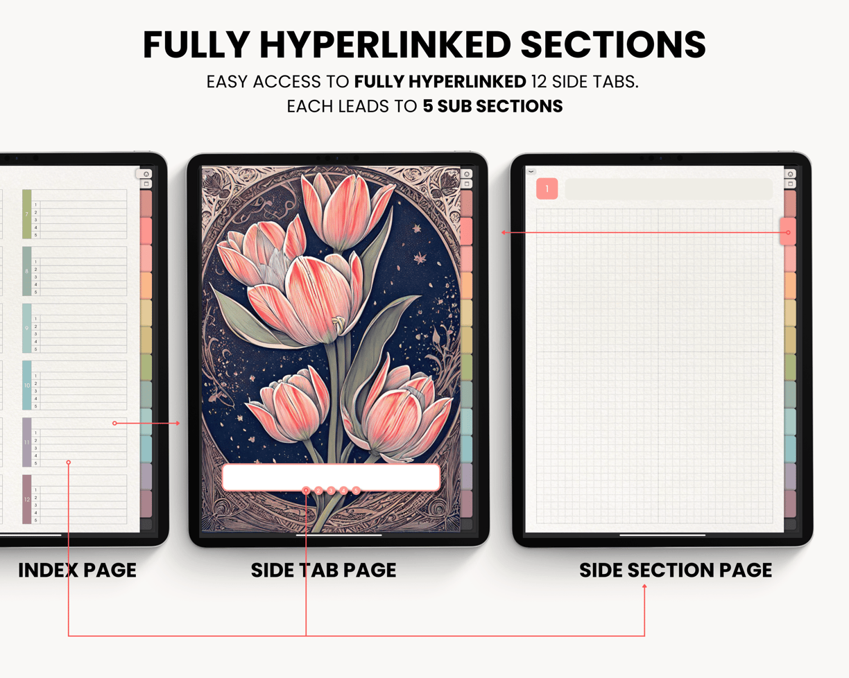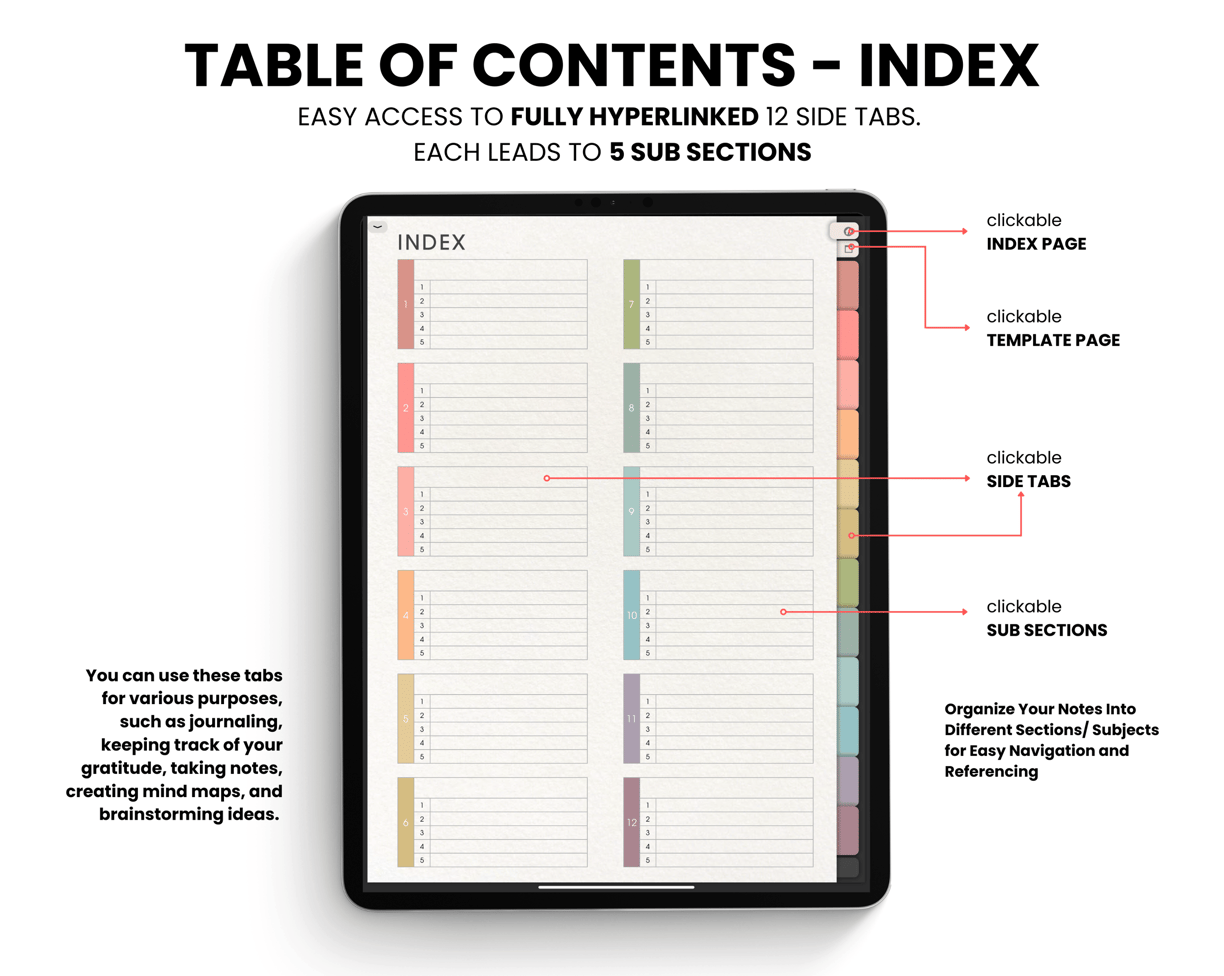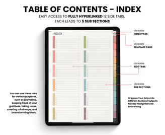12 side tabs, each of which leads to 5 sub-sections. This allows you to organize your home, projects, study, work, clients, etc. in one place.